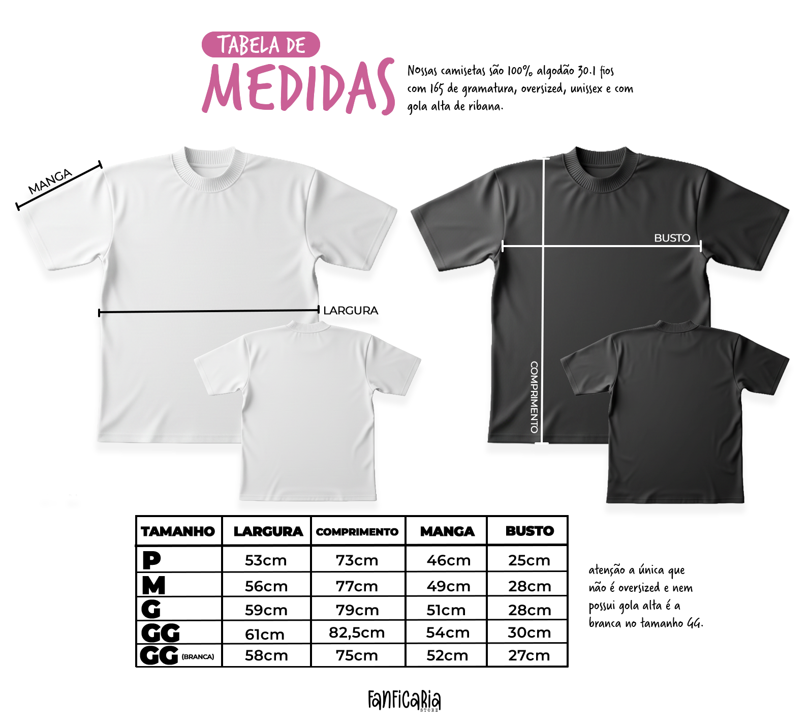*OBSERVAÇÃO: Nossas camisetas são 100% algodão, gola alta de ribana, oversized e unissex.